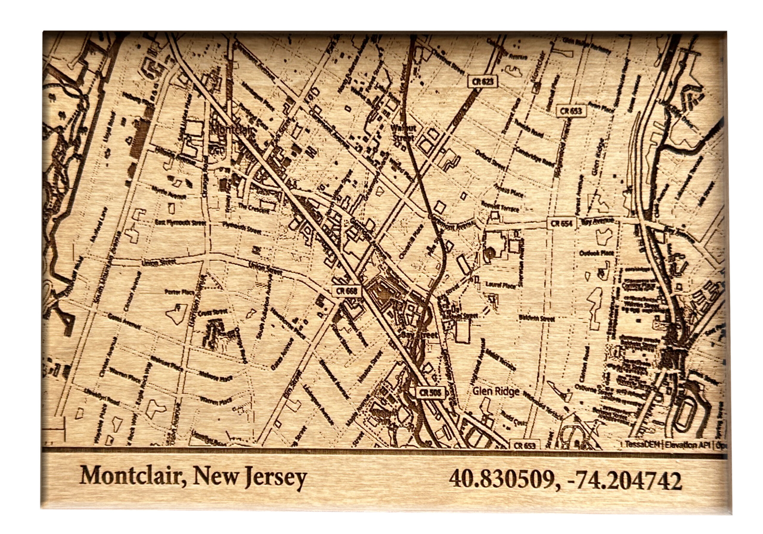 wooden engraved custom topographic map of Montclair NJ